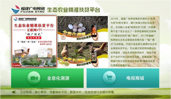 首页 > 精准扶贫平台 集团结合《中共中央国务院关于实施乡村振兴战略的意见》文件精神,按照国家“精准扶贫、精准脱贫”的基本方略,打造生态农业精准扶贫平台。平台结合先进物联网技术,通过将养殖全程直播的方式,向消费者实时展示养殖环境和养殖方式,打通消费者与养殖户之间的信任壁垒,搭建了福建广电网络可视化定制农业电视商城+微商城全息化溯源的销售平台,具有良好的社会效益。